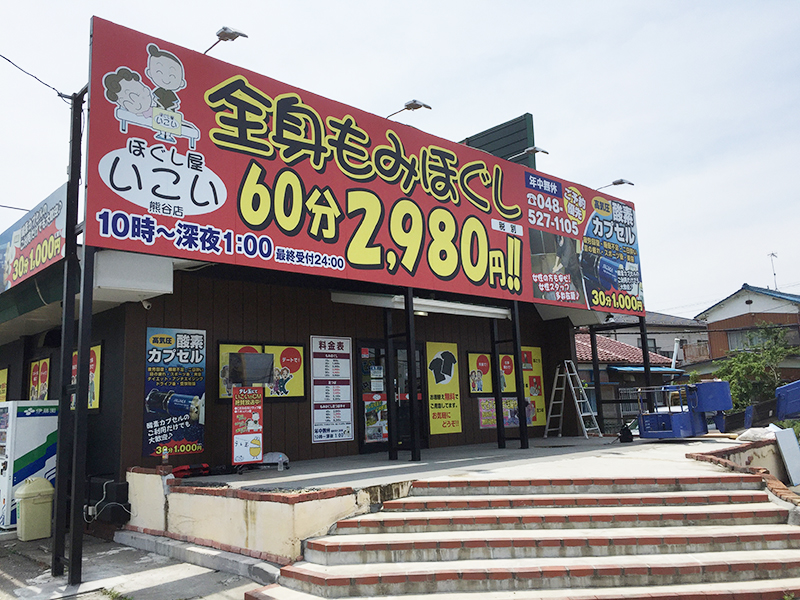 ほぐし屋いこい杉戸店ー看板施工ー壁面パネル&横断幕の施工